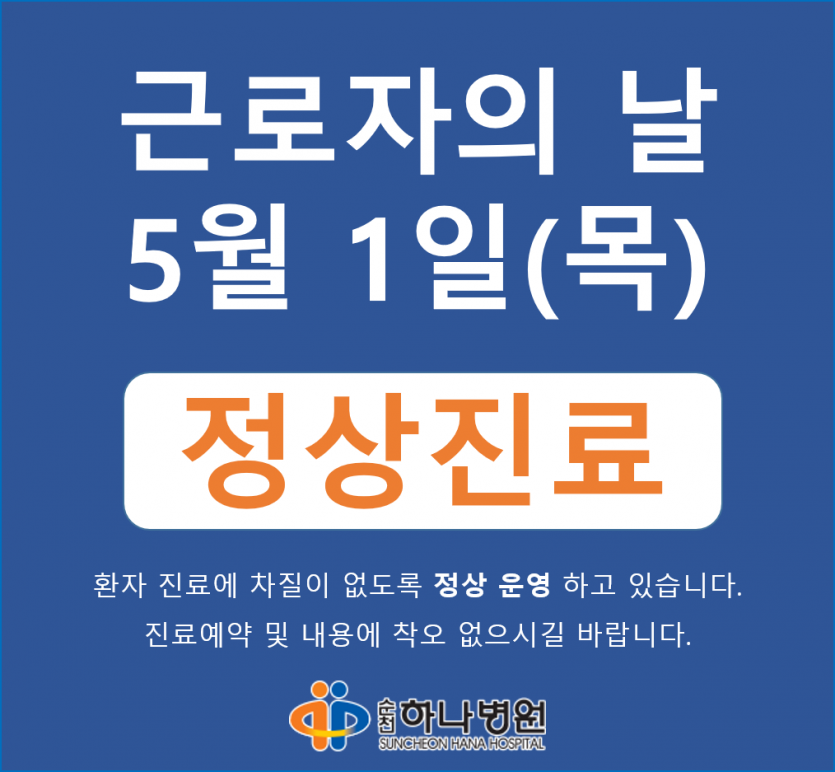 순천하나병원 2025년 05월 01일 목요일 '근로자의 날' 정상진료 합니다 페이지 정보 작성자 순천하나병원 댓글 0건 조회 1,335회 작성일 25-04-28 10:34 목록 본문 이전글순천하나병원 2025년 5월 5일(월) 어린이날, 5월 6일(화) 대체휴일 진료 합니다 25.04.29 다음글순천하나병원 2025년 삼일절과 3월3일 대체휴일 진료 합니다 25.02.24 댓글 0 댓글목록 등록된 댓글이 없습니다.